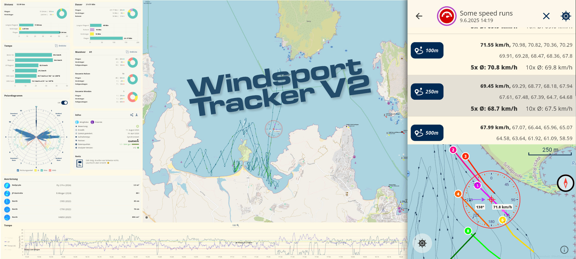 WindsportTracker V2 is an app that allows you to track sports such as windsurfing, wing foiling, and kitesurfing. The app is designed to automatically recognize maneuvers (jibes, tacks, 360° turns), provide wave analysis, and evaluate speed runs. Related sports such as parawing and pump foiling are also supported.